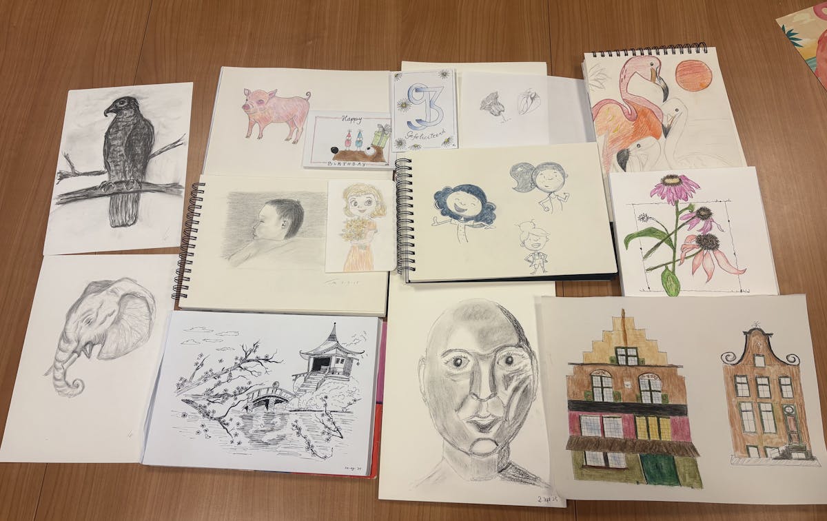 Het is ontzettend gezellig bij de workshop tekenen op iedere dinsdagmiddag van 14.00 tot 16.00 uur in ‘t Hart in Ewijk.