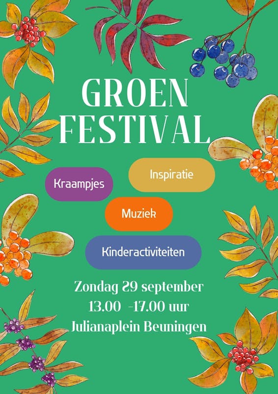 Groen Festival - Zondag 29 septemberNog even en dan is het zover.... voor de tweede keer organiseert Het Dijkmagazijn in samenwerking met Hart van Beuningen hét Groen Festival binnen de gemeente Beuningen. Laat je inspireren op het gebied van groen en duurzaamheid! Uiteraard met activiteiten voor jong en oud. Zien we je daar?