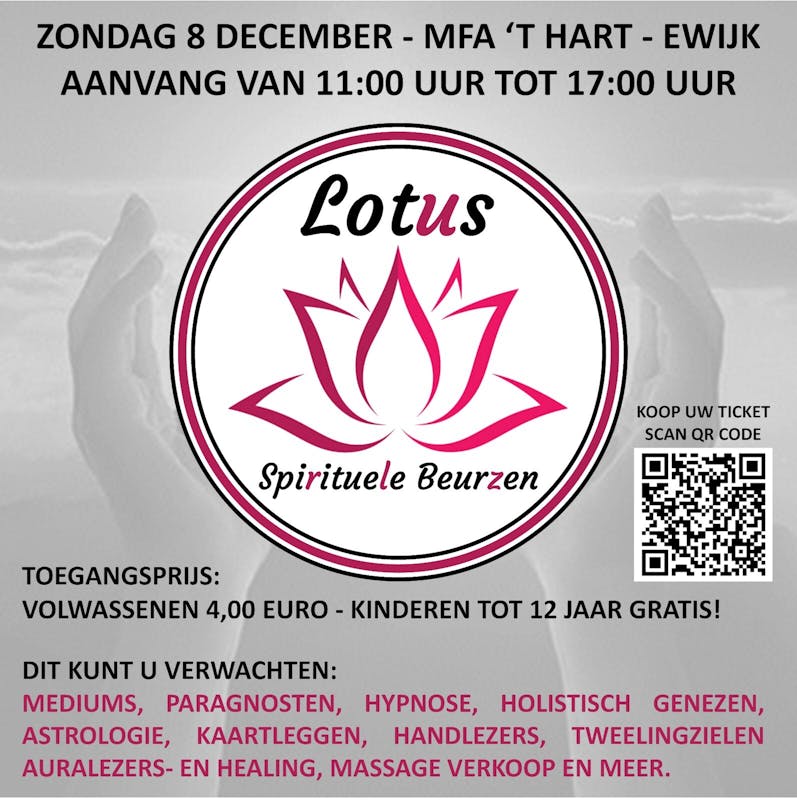 Op zondag 08 december aanstaande, vindt onder de naam LOTUS! een spirituele beurs plaats in MFC 'T HART in EWIJK. Deze beurs en locatie zijn niet nieuw maar door diverse omstandigheden heeft deze even niet plaatsgevonden. |
