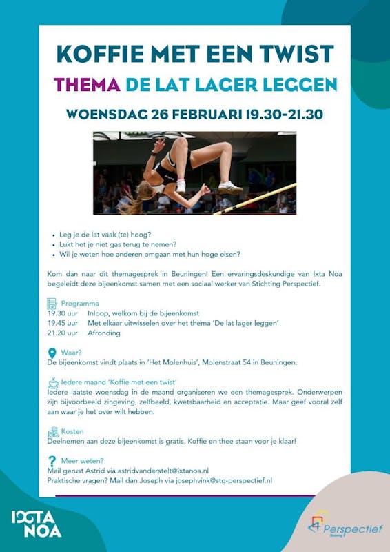 Kom gezellig naar onze maandelijkse Koffie met een Twist! Deze keer staat het thema De Lat Lager Leggen centraal. Hoe geven we onszelf wat meer ademruimte en genieten we meer van het moment zonder altijd perfect te willen zijn? Praat mee, deel je ervaringen en laat je inspireren onder het genot van een kopje koffie of thee. Iedereen is van harte welkom!