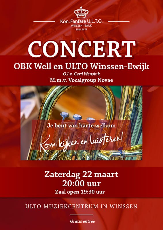 Op 22 maart a.s. geeft het fanfareorkest van Koninklijk fanfare ULTO in hun eigen muziekpaleis een gratis concert! Samen met de nieuwe vocalgroup Novae en fanfareorkest OBK uit Well verzorgen ze samen een eigentijds concert met populaire hedendaagse muziek.