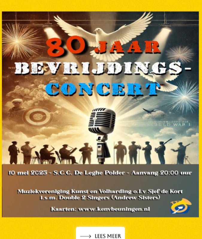 Op 10 mei nodigen we je uit voor een bijzonder Bevrijdingsconcert in S.C.C. De Lèghe Polder. Dit unieke muzikale evenement neemt je mee op een emotionele reis van oorlog naar vrijheid – een avond vol herinnering, hoop en feest!