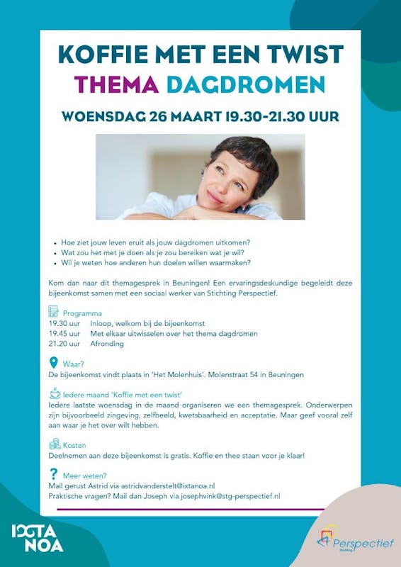 Iedere maand organiseert Ixta Noa in samenwerking met Stichting Perspectief thema bijeenkomsten. Dit keer hebben we het over dagdromen. Sluit jij ook aan?