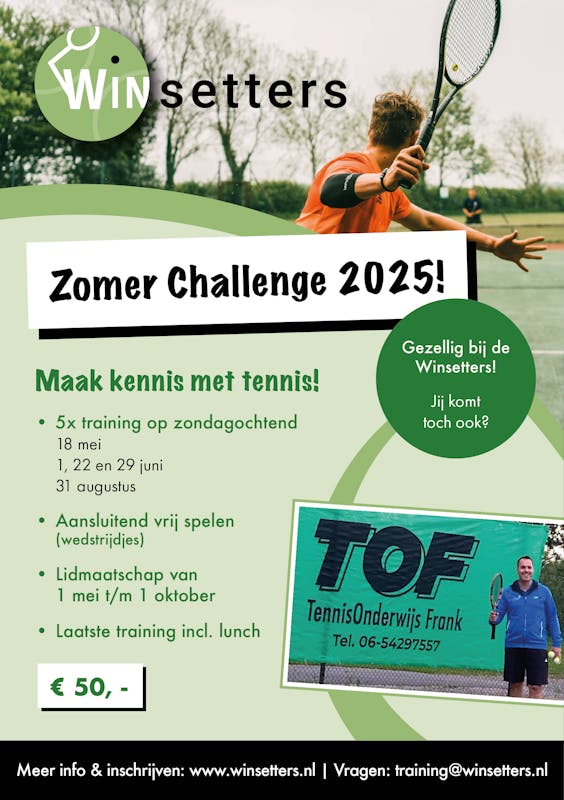 Bij De Winsetters in Winssen is een speciale actie om zoveel mogelijk mensen, jong & oud, kennis te laten maken met de tennissport. Voor slechts € 50,- kun je het tennisspelletje al aardig onder de knie te krijgen.