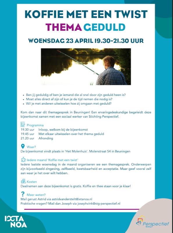 Tijdens deze avond gaan we in gesprek over het thema geduld. Wat betekent geduld voor jou? Hoe ga je ermee om in het dagelijks leven? Er is ruimte om ervaringen uit te wisselen en elkaar te inspireren. De bijeenkomst wordt begeleid door een ervaringsdeskundige en een sociaal werker van Stichting Perspectief.
