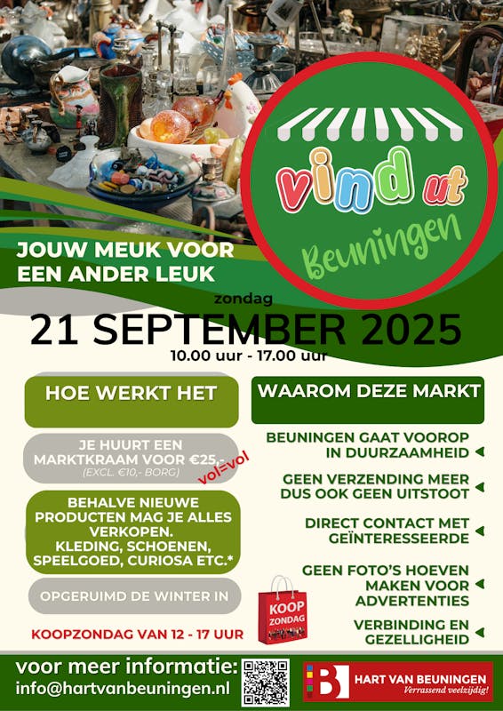 De markt zal plaatsvinden op zondag 21 september, tegelijkertijd met de koopzondag, zodat je meteen kunt genieten van de gezellige sfeer in Beuningen terwijl je je spullen verkoopt!