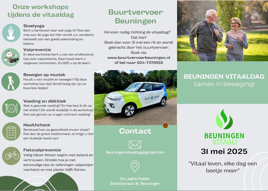 Voor alle ouderen uit gemeente Beuningen wordt op 31 mei de Beuningen Vitaal Dag georganiseerd door studenten van HAN en Hofstede fysiotherapie. De Vitaaldag staat in het teken van plezier, gezondheid en nieuwe energie: een inspirerende dag vol activiteiten, workshops en ontmoetingen die laten zien hoe leuk en makkelijk het is om vitaal te blijven op oudere leeftijd, zowel fysiek als mentaal. Naast workshops zijn er ook informatieve kraampjes aanwezig (over stoppen met roken, valpreventie, Beuningen Samen).