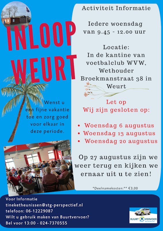 Inloop Weurt is wegens vakantie deze drie woensdagen gesloten.