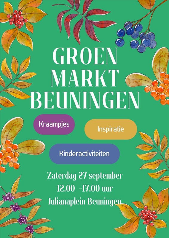 Groen Markt, zaterdag 27 september, 12.00 – 17.00 uur. Julianaplein, Beuningen Meer informatie zie www.dijkmagazijnbeuningen.nl.