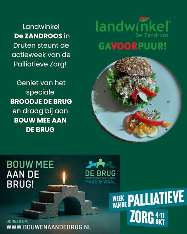Zij steunen de actieweek van de Palliatieve zorg en serveren Broodje De Brug en doneren per Broodje de Brug €5,00 aan Hospice De Brug.