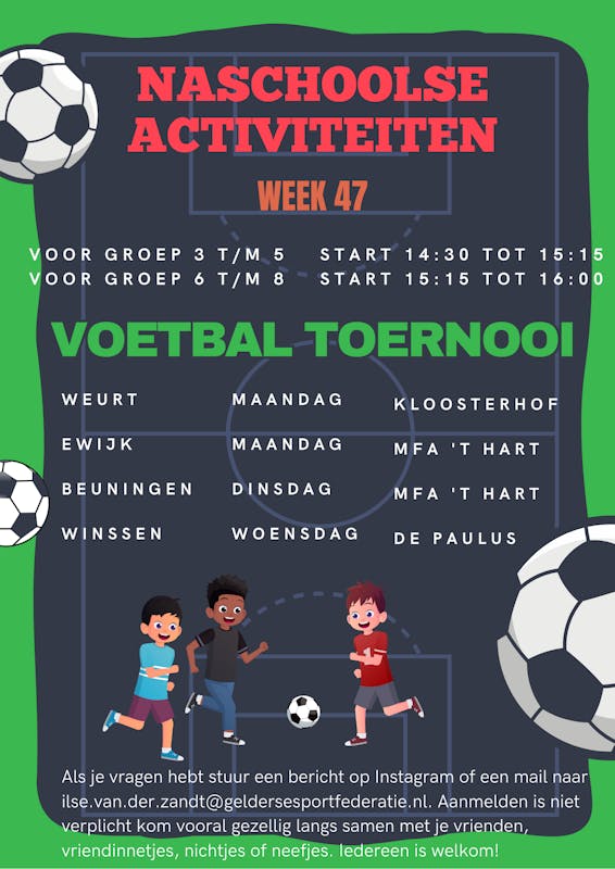 Voor kinderen van groep 3 t/m 5 van 14:30-15:15 uur en voor kinderen van groep 6 t/m 8 van 15:15-16:00 uur.