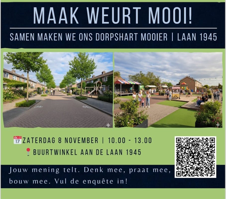 Kun je zaterdag niet langskomen, of wil je eerder al input leveren, dan kan dat via: Link naar enquête Maak Weurt Mooi
