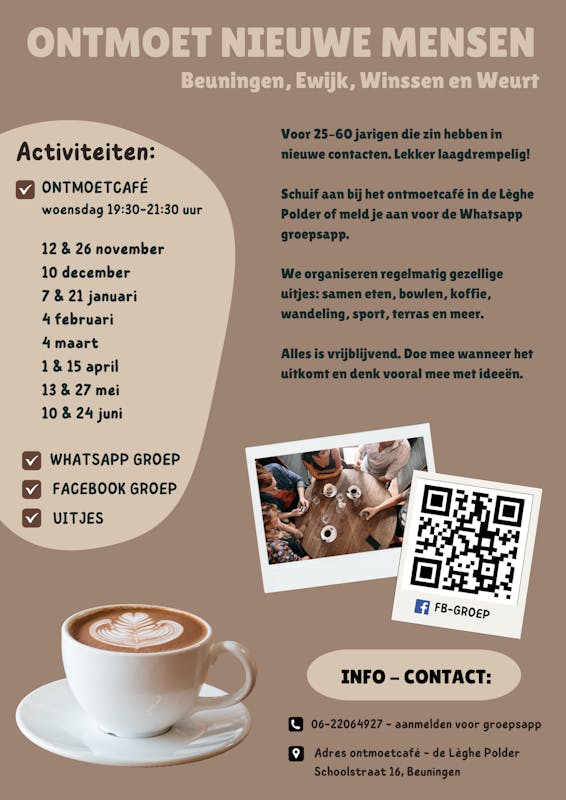 Deze groep is voor iedereen tussen de 25 en 60 jaar oud die nieuwe mensen willen leren kennen in de gemeente Beuningen. Gewoon gezellig.......