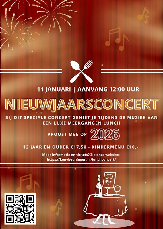 Concerttoegang met kindermenu bedraagt €10 p.p, met luxe lunch €17,50 p.p. Het concert vindt 11 januari 2026 plaats in De Lèghe Polder, Schoolstraat 16 in Beuningen. Het begint om 12 uur, de deuren van de zaal gaan open om 11:30 uur.