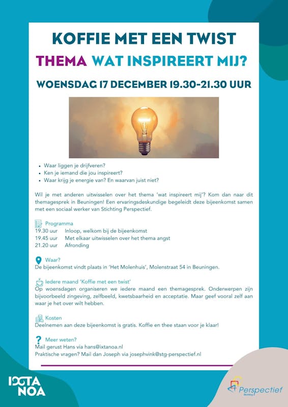Woensdag 17 december vindt de volgende bijeenkomst van 'Koffie met een Twist' plaats in Beuningen. De bijeenkomst van deze maand heeft als thema: 'wat inspireert mij?'.