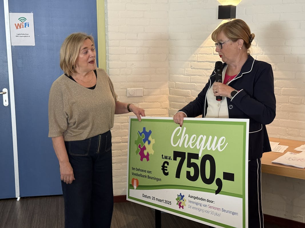 De Voorzitter begon de vergadering met het namens de leden uitreiken van een cheque van maar liefst € 750,00 aan Monique Hermens van de Voedselbank Beuningen. Dit bedrag is opgehaald tijdens het vieren van het 75-jarig jubileum op zaterdag 18 januari.