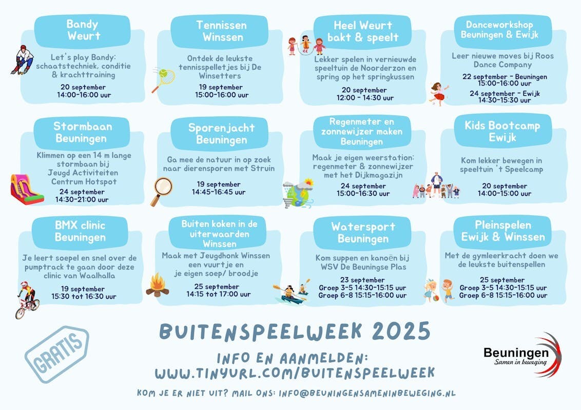 Doe je ook mee met de activiteiten tijdens de Buitenspeelweek in de gemeente Beuningen? Van harte welkom om aan te sluiten bij het vuur maken, springkussen, dansworkshop, sippe...