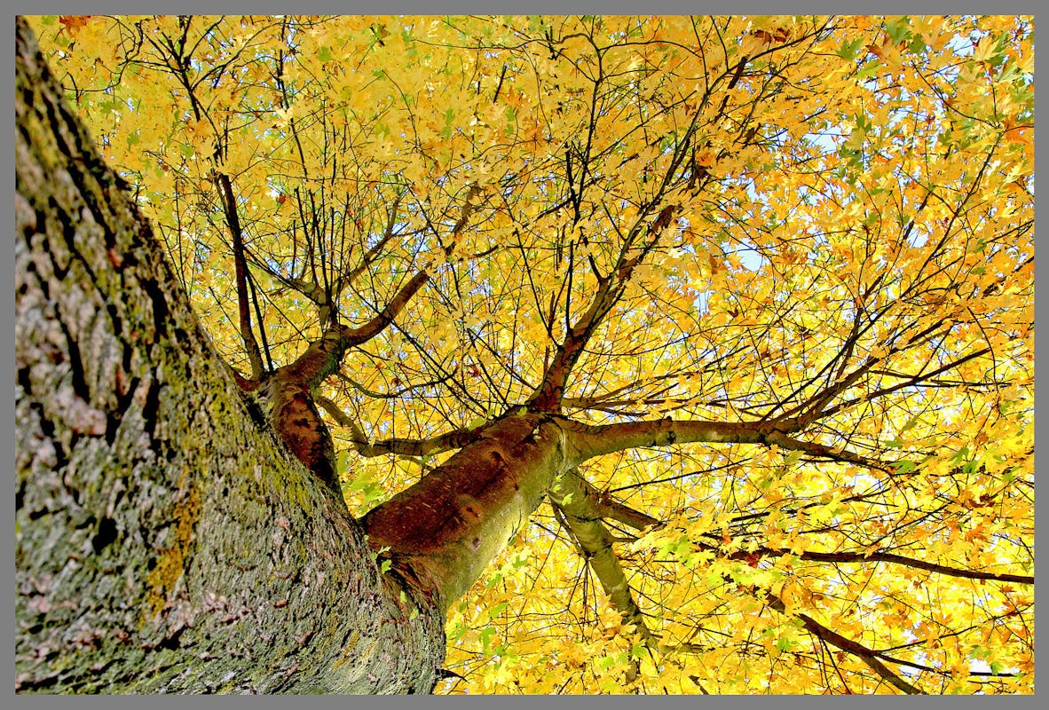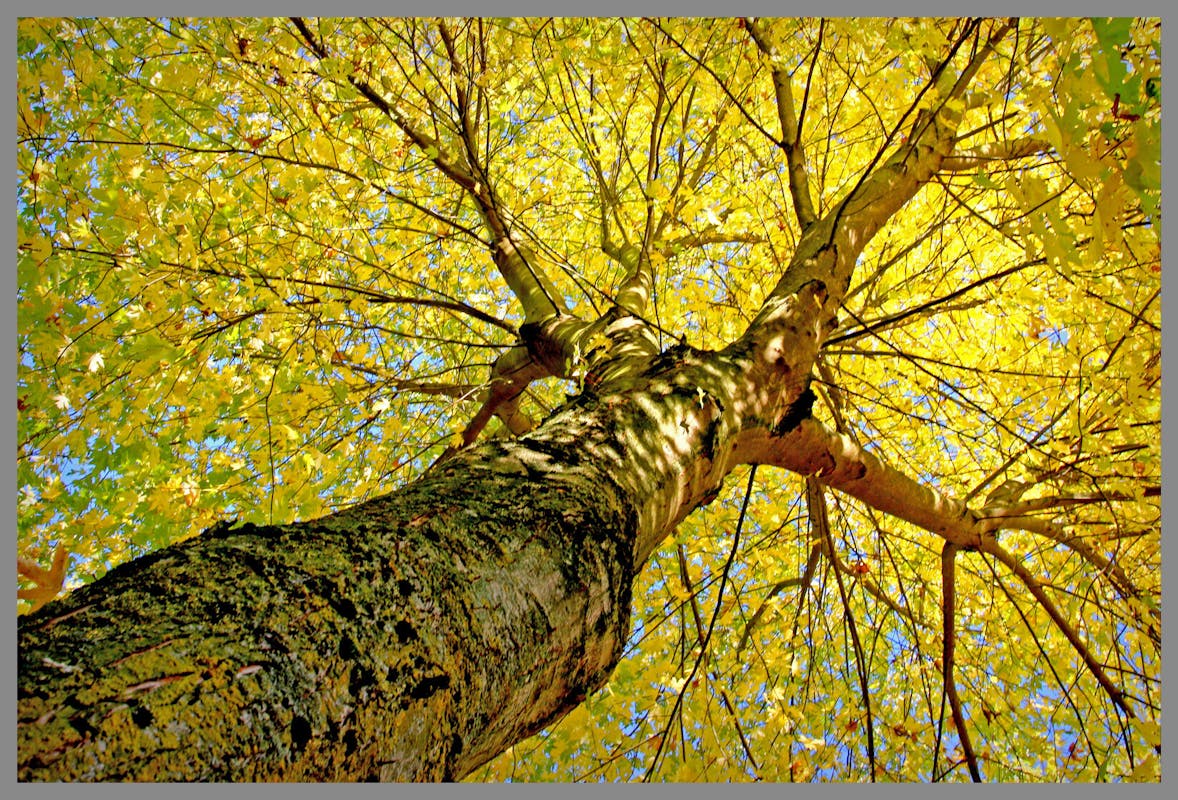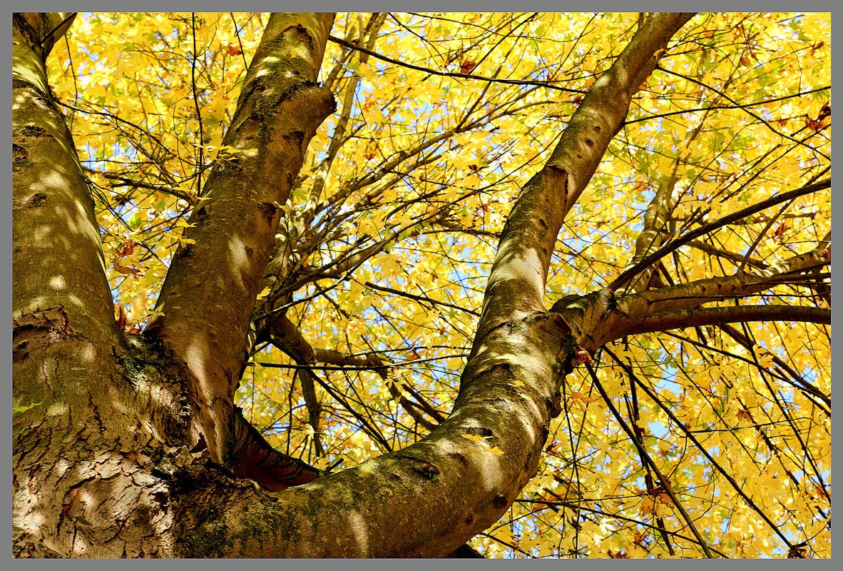 De herfst is duidelijk zichtbaar in de kleuren en de bladeren die zich vastklampen aan de schors. Dit soort details maakt de natuur erg intrigerend, omdat het altijd nieuwe vor...