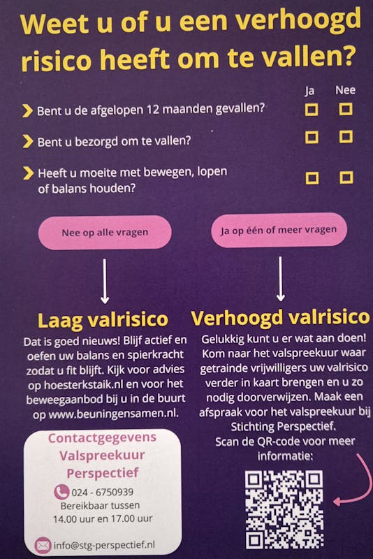* Mocht u vragen hebben omtrent vallen, bent u al een keer gevallen, heeft u valangst of een slechte balans neem dan contact op met Stg. Perspectief voor het Valspreekuur. Meer informatie is te lezen in de folder.