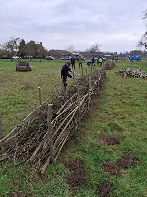 De nieuwe groep dinsdag-vrijwilligers (zie …) en de timmermannen van VLB kunnen niet wachten om aan de slag te gaan met al deze plannen, maar een deel van het werk kan pas starten als de gemeente groen licht geeft voor de tweede fase van het plan. Intussen zijn al wel de takkenrillen gemaakt en op 15 april wordt de meidoornhaag geplant. Het begin is er.