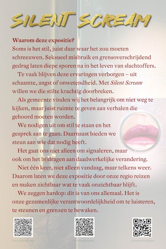 Tot en met 2 juni is het fotokunstproject ‘Silent Scream’ te zien in het gemeentehuis van Beuningen. De tentoonstelling van kunstenares en fotograaf Henriette van Gasteren geeft slachtoffers, daders en experts een stem in het gesprek over seksueel geweld.