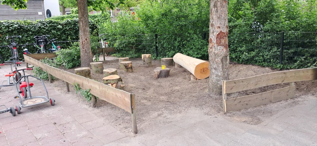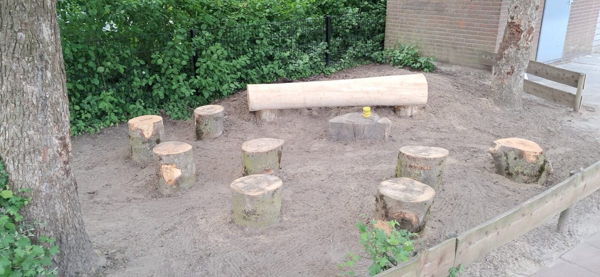 In een afgeschot, groen hoekje van het schoolplein bij kindcentrum Montijn is door vrijwilligers van VLB en van Montijn een nieuwe vertel/leeshoek gemaakt. Een drie meter lange, liggende boomstam met daarvoor, verspreid, een aantal rechtopstaande stammen als krukjes.