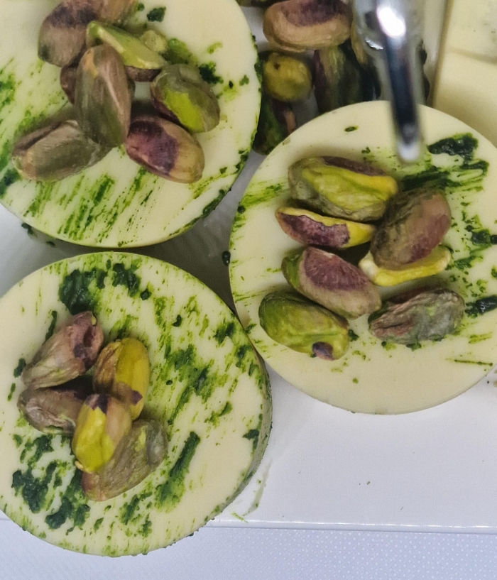 Garneer met een beetje gehakte pistachenoten of een dun lijntje pistachecrème.