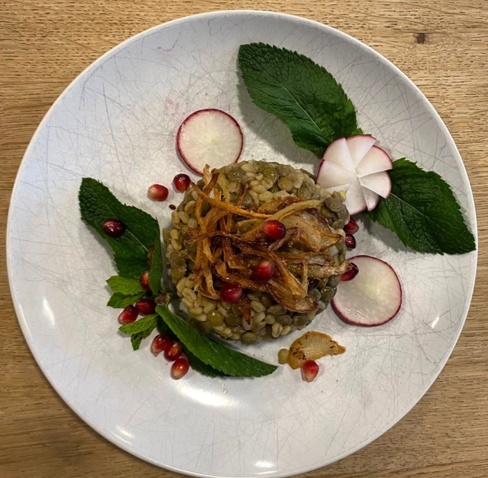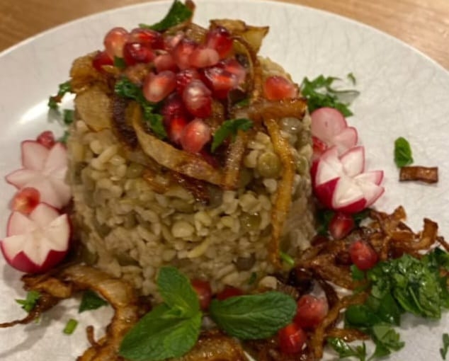 5. Serveer de Mujaddara gegarneerd met gebakken ui, Granaatappel, en verse groenten naar keuze.