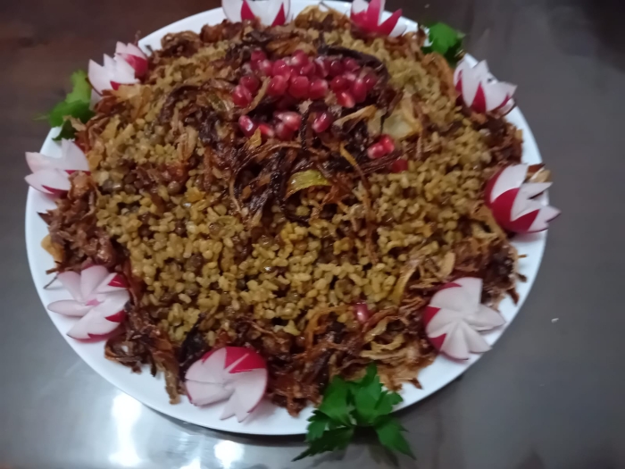 Over het gerecht:Mujaddara met bulgur is een van de meest geliefde vegetarische gerechten uit de Syrische keuken. Het zit boordevol plantaardige eiwitten en vezels, wat het een voedzame en energierijke maaltijd maakt. Ideaal voor vastenperiodes of voor wie op zoek is naar een gezonde en eenvoudige maaltijd. Serveer met yoghurt, Augurken, salade, ingelegde groenten en garneer met verse groenten en gebakken ui.