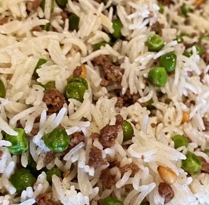 Meng goed. Voeg 400 gram basmatirijst toe en bak dit 2 minuten mee. Giet 600 ml water of bouillon erbij, dek de pan af en laat de rijst op laag vuur koken totdat al het vocht is opgenomen.