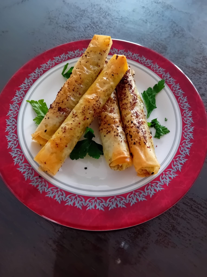 Voor de rolletjes: 10 tot 12 vellen filodeeg of sambousakdeeg.