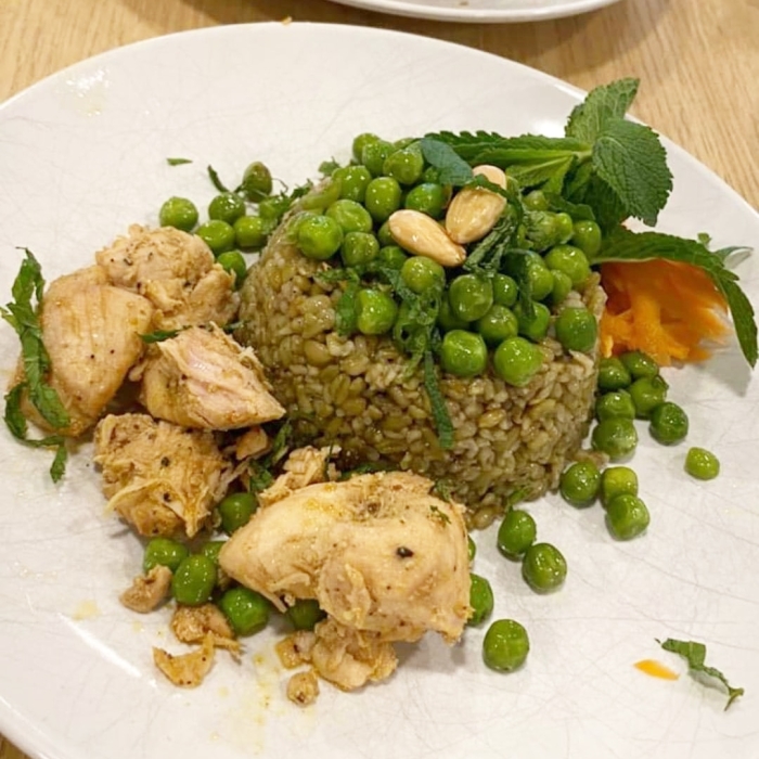 - Roer de gekookte groene erwten door de freekeh of gebruik ze als garnering.