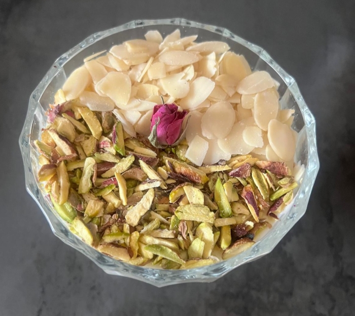 7. Garneer met slagroom, gehakte pistachenoten, amandelen en eetbare rozenblaadjes.
