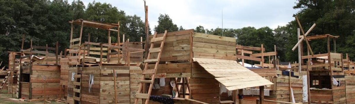Op het veld worden houten pallets neergelegd en hiermee mogen de kinderen naar hartelust gaan bouwen.